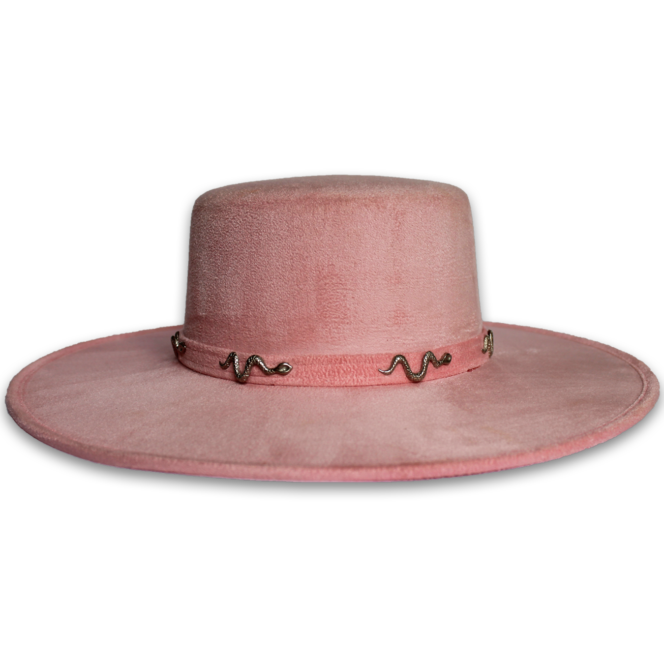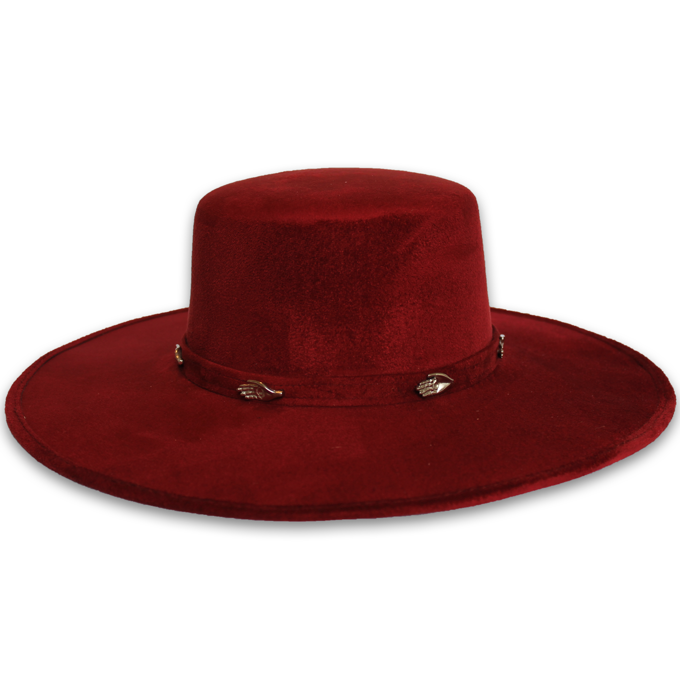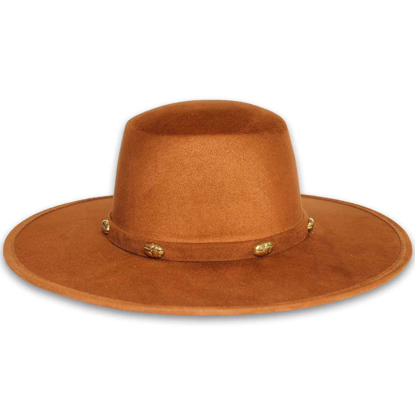 Rigid suede hat with gold/silver plated brass applications.